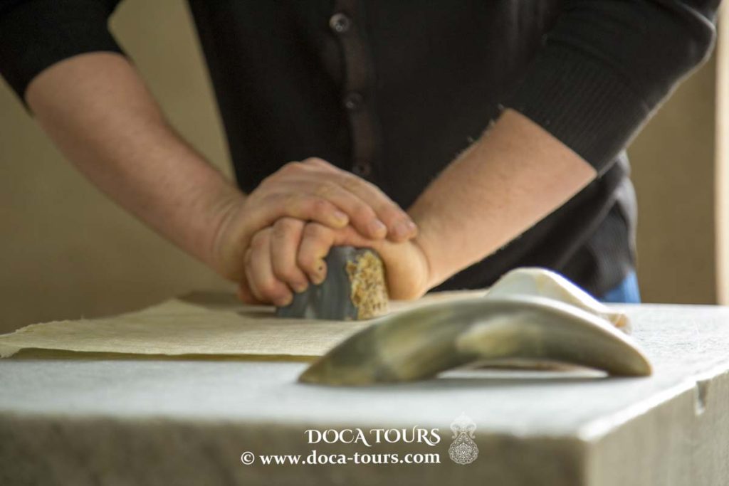 7️. Schließlich wird das Papier auf einer Marmorplatte mit einer Muschel oder einem Achatstein poliert.
