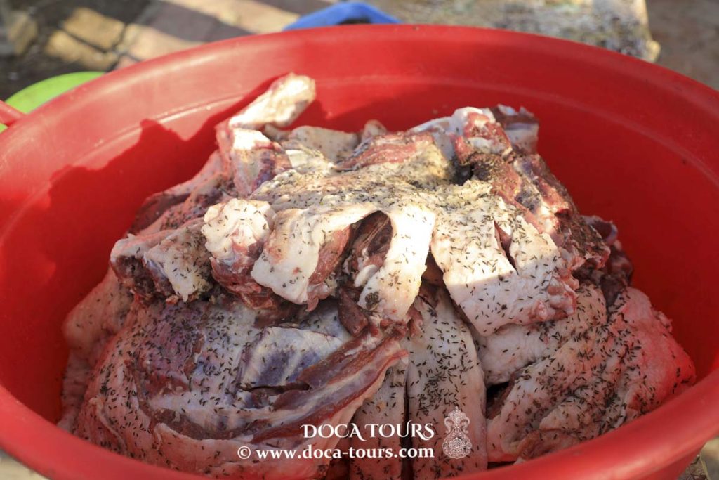 Über Nacht ruhen lassen. Manche behaupten, dass Fleisch erst am Ende gesalzen werden sollte, da es sonst zäh werden könnte. Dies gilt jedoch nur für kleine Stücke. Wir haben die Keule und das Schulterblatt – zwei große Stücke des Kadavers. Sie benötigen Zeit, um richtig durchzusalzen. Es ist übrigens in der usbekischen Küche Tradition, Lammkadaver einen ganzen Tag lang in stark gesalzenem Wasser einzuweichen. Dennoch nimmt das Fleisch nicht mehr Salz auf, als es benötigt.
