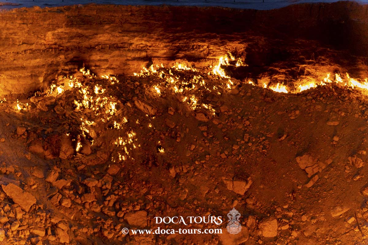 - Anschließend reisen Sie zum Darvaza-Gaskrater in der Karakum-Wüste (270 km, 4 Stunden). Die letzten 8 km zum Krater überqueren Sie die Sanddünen in einem Allradfahrzeug. Nach Ihrer Ankunft am Abend errichten Sie Ihr Lager und genießen einen spektakulären Sonnenuntergang, während die Flammen des Kraters den dunklen Wüstenhimmel erleuchten. Die Feuergrube, etwa 80 Meter im Durchmesser und 30 Meter tief, bietet eine faszinierende Aussicht – das Erlebnis, in die „Tore zur Hölle“ zu blicken, ist wahrhaft unvergesslich. Lassen Sie den Abend mit einem köstlichen Abendessen am Feuer ausklingen und entspannen Sie sich in der Nähe des brennenden Kraters. Die Übernachtung erfolgt in Zelten oder einer traditionellen Jurte.