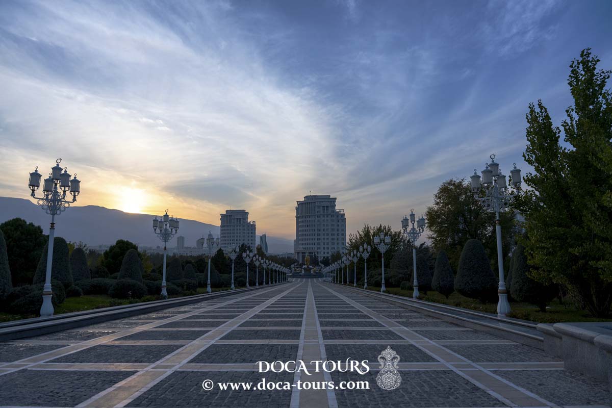 - Unabhängigkeitspark mit dem jurtenförmigen Unabhängigkeitsdenkmal, das das Museum der Nationalen Werte beherbergt. Der Park ist von prächtigen Brunnen, 27 Statuen bedeutender turkmenischer Persönlichkeiten und einer goldenen Skulptur von Niyazov umgeben.