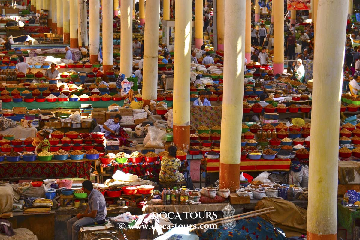 - Anschließend besuchen Sie die Zentralmoschee und die Olim Dodkhoh Medrese, beide aus dem Mittelalter, wunderschön restauriert und Zeugnisse der religiösen Geschichte der Stadt. Danach geht es weiter zum Pandschakent-Basar, einem geschäftigen Markt voller Energie, wo Sie frische Produkte, Gewürze, handgefertigte Textilien und Souvenirs entdecken können.