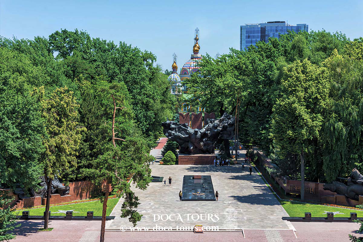 - Panfilov-Park: Schlendern Sie entlang der schattigen Wege des Panfilov-Parks, benannt nach dem angesehenen General, der sein Leben bei der Verteidigung seiner Heimat opferte. Im Herzen des Parks befindet sich das Denkmal des Zweiten Weltkriegs, das eine monumentale Skulptur von Soldaten zeigt, die mutig nach vorne marschieren. In der Nähe brennt die Ewige Flamme zum Gedenken an die gefallenen Helden.