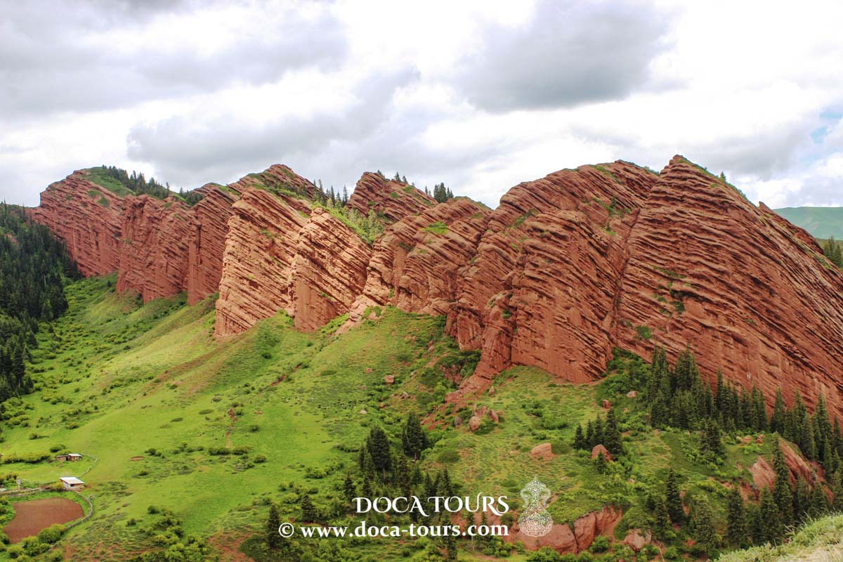 - Die malerische Schlucht Jety-Oguz ist bekannt für ihre dramatische Landschaft, umgeben von einem dichten Nadelwald und gespickt mit auffälligen roten Sandsteinformationen.