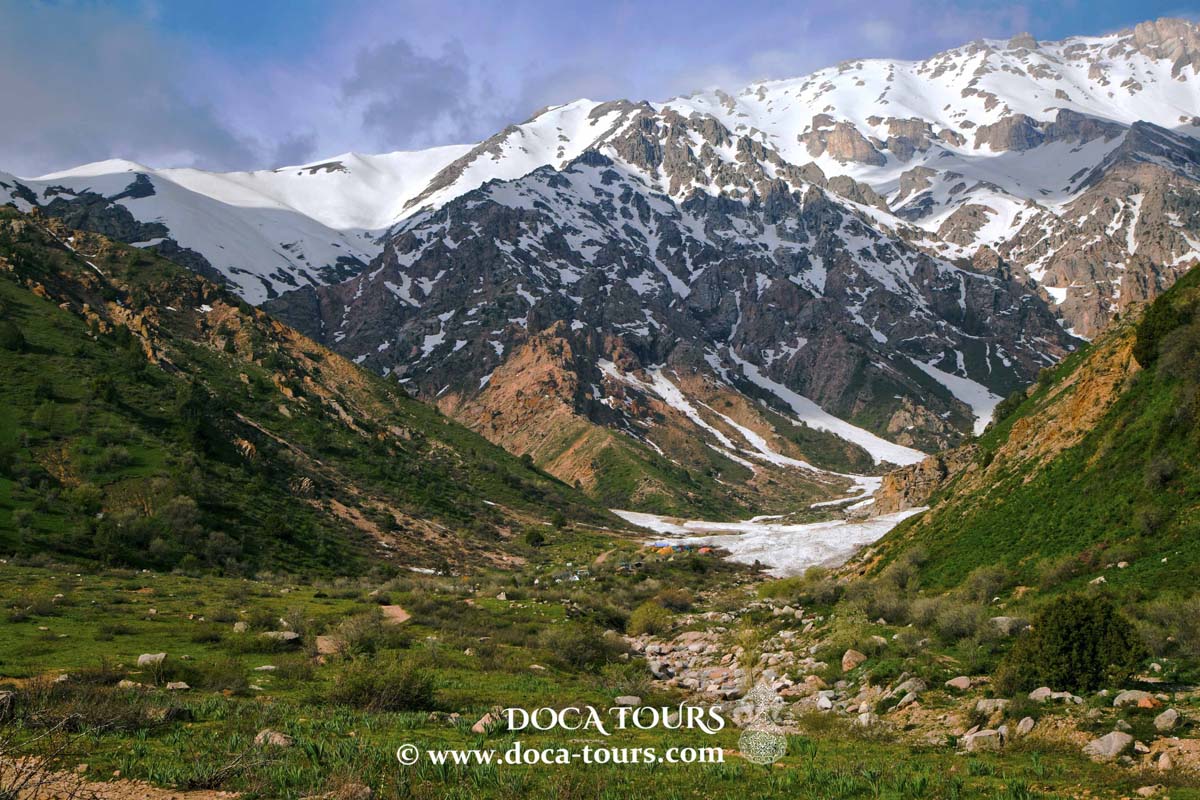Von hier aus haben wir einen herrlichen Blick auf das Tal, den Nurekata-Fluss und den Gipfel des Großen Tschimgan (3.309 m über dem Meeresspiegel).