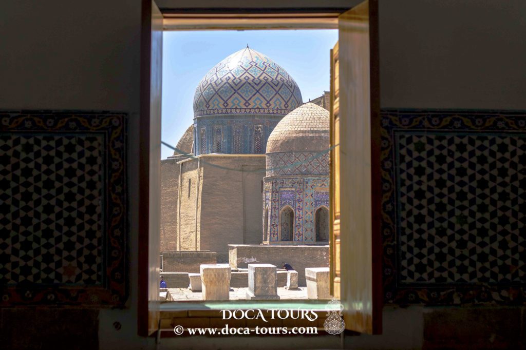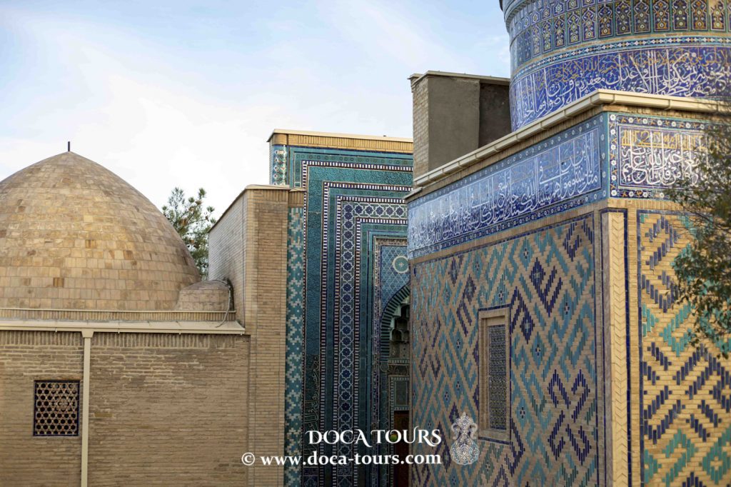 “La Perla de Shahi Zinda” se considera el mausoleo de Shadi-Mulk-Aka. Este mausoleo fue construido en 1327 para la sobrina de Timur, Shadi-Mulk-Aka. Es una de las estructuras más antiguas de Samarcanda construidas durante la época de Timur. Decorado con muchas losas de cerámica en las paredes, este mausoleo impresiona por su intrincada ornamentación y la imagen de enredaderas que fluyen en el tímpano sobre el arco. Su gracia y belleza son realmente hipnotizantes.