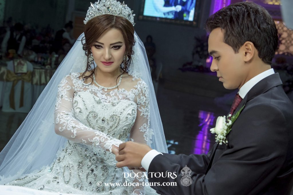 La celebración de la boda comienza por la tarde, no antes de las seis en punto. Todos los parientes del novio y los miembros más cercanos de la familia de la novia son invitados al “Toy-Merkany” (restaurante especial). El número total de invitados puede alcanzar de 500 a 1000 personas. Cuanta más gente haya en la boda, más lejos se difundirá el mensaje de hospitalidad y generosidad de los organizadores. El restaurante también recibe al presentador, DJ, cantantes y bailarines que actúan para los invitados.
