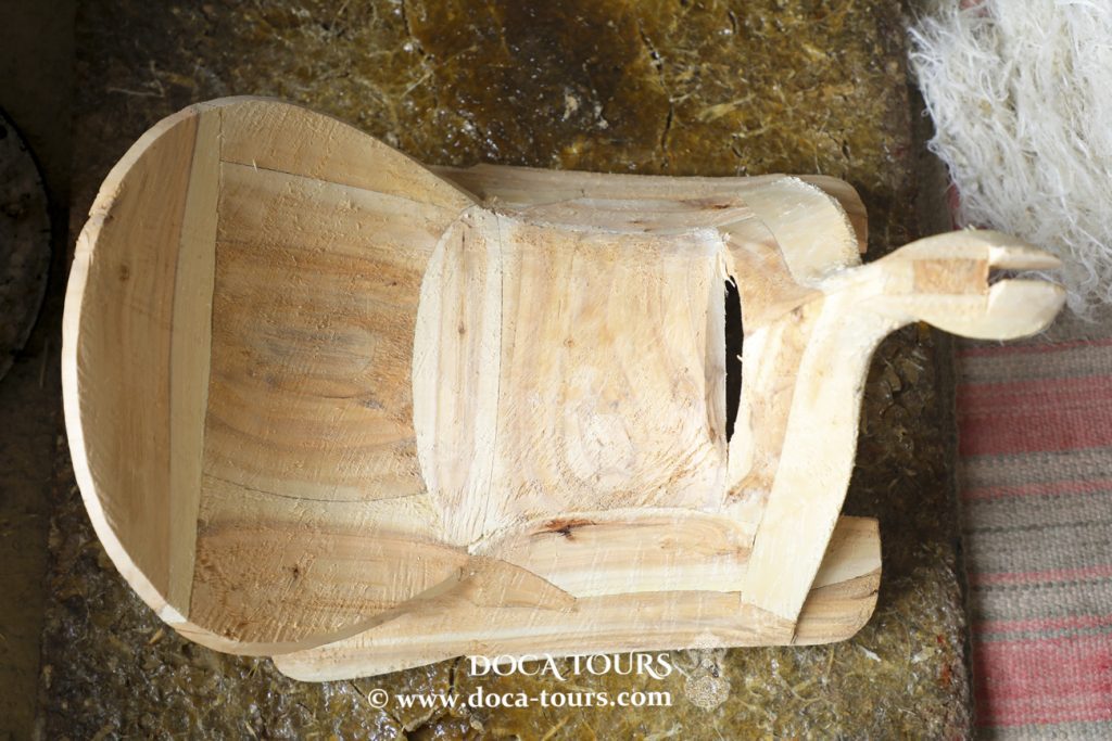 El artesano utiliza madera de sauce local para fabricar la silla. Es un material blando que se trabaja fácilmente. Se utilizan tendones de vacas y ovejas, así como corteza de abedul.