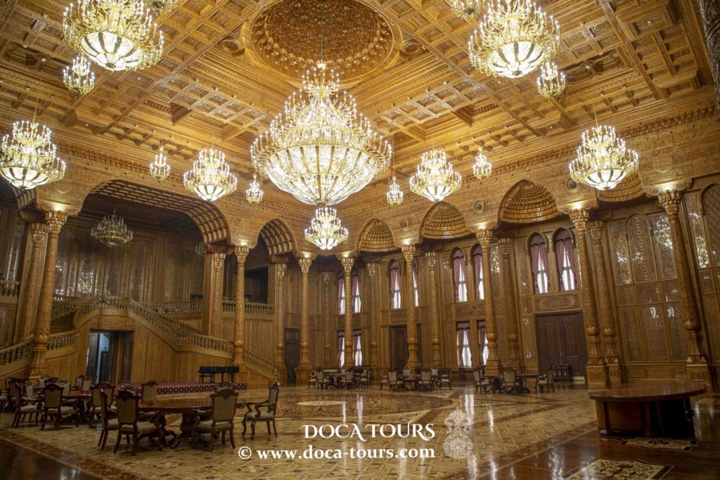 - Sala Zarandud: Debido a su abundancia de hojas de oro de 24 quilates, esta lujosa sala también se conoce como la «sala dorada». Magníficas columnas de yeso de marfil conducen a una gran cúpula que no desentonaría en una majestuosa mezquita. El enorme candelabro que cuelga en el centro del espacio es aún más impresionante.