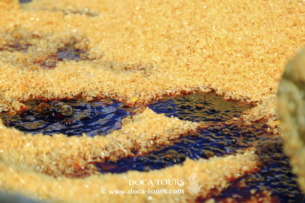 - Preparar el arroz: Lava el arroz 7–8 veces con abundante agua hasta que quede clara. Luego cúbrelo con agua tibia (37 °C), agrega sal generosamente y déjalo reposar 1 hora. Vierte un poco de agua caliente sobre las pasas.