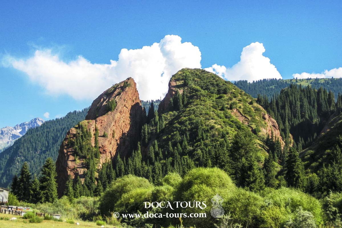 Tras Karakol, Cañón Jeti Oguz (25 km, 30 min), con bosques y formaciones rocosas rojas. Caminata de 1 hora para ver Seven Bulls y Broken Heart, formaciones famosas para fotos memorables.