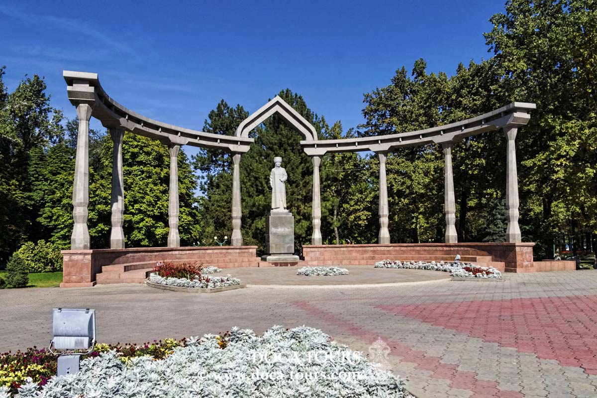 Continuando, Oak Park y Erkindik Boulevard, rodeado de árboles frondosos. Al final del boulevard, estatua de Kurmanjan Datka, líder del siglo XIX, conocida como “Reina de las Montañas”.