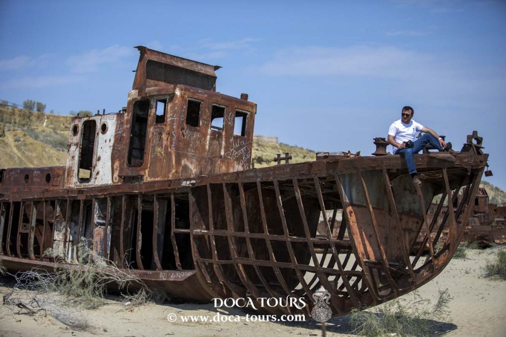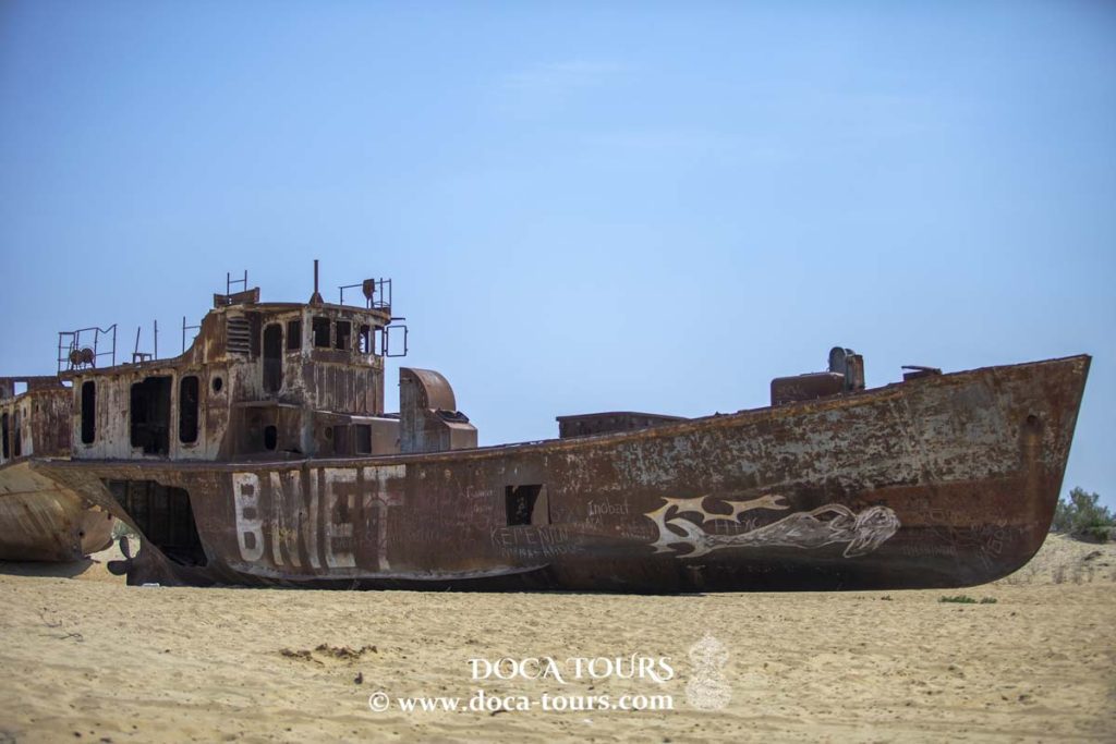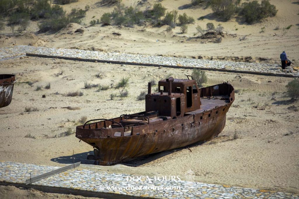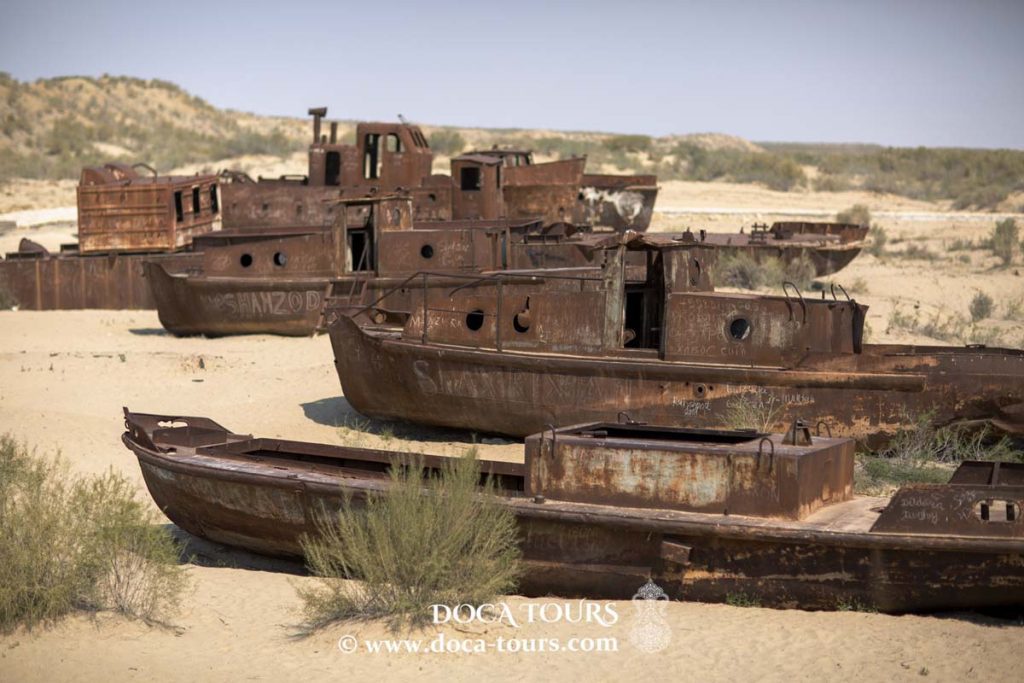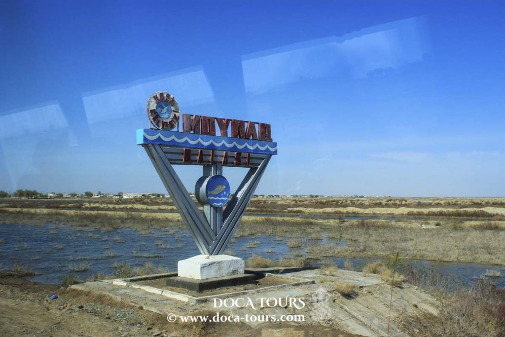 En raison du retrait de la mer d’Aral, Muynak se trouve désormais à environ 100 kilomètres du rivage. Ce qui était autrefois un fond marin, apprécié pour ses plages de sable, ses riches pêcheries et son immense étendue d’eau, est désormais devenu un désert, appelé par les habitants l’Aralkoum — l’équivalent du désert du Kyzylkoum. Autrefois navigué par des navires maritimes, cet espace est aujourd’hui jonché d’épaves abandonnées et rouillées échouées dans l’ancien port de Muynak.