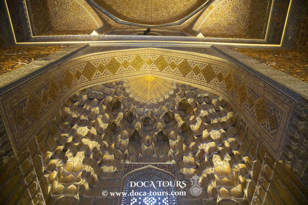 Les niches arquées en forme de trèfle du mausolée Gur-Emir sont couronnées de demi-coupoles stalactites décoratives. Les plans verticaux des stalactites sont ornés de petits losanges dorés formant des hexagones avec un point doré en leur centre, ainsi que de spirales bleues. Les plans triangulaires des stalactites sont décorés de fleurs dorées sur fond bleu. Sur les soffites des niches, des chaînes alternant grands et petits carrés sont réalisées en relief de ganch avec du papier sur la surface. Sur ces carrés, les mots « Muhammad » et « Allah » sont représentés en lettres koufiques.
