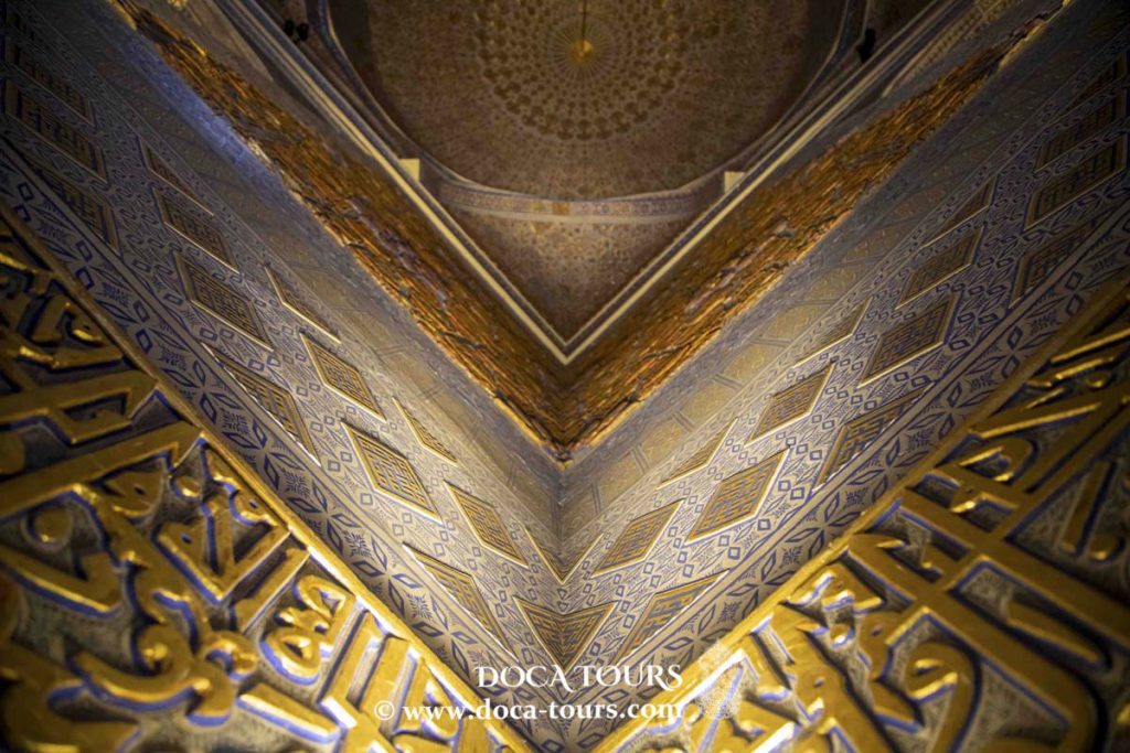 La décoration variée en peintures bleu-or de Guri Emir crée une atmosphère impressionnante à l’intérieur du mausolée. Ces peintures couvrent toutes les surfaces, du bas des murs jusqu’au sommet de la coupole, conférant au mausolée une beauté et une finesse particulières. Les peintures ont été réalisées à l’aide de couleurs à base de colle et de reliefs en papier mâché. Les maîtres ont utilisé divers pigments minéraux tels que l’outremer naturel pour le bleu, des verts à base de cuivre comme le malachite ou la chrysocolle pour le vert, l’ocre rouge avec une touche de vermillon pour le rouge, l’ocre pour le jaune, de l’os brûlé pour le noir, et le ganch pour le blanc. Cette décoration crée une image majestueuse et confère au mausolée un attrait particulier.