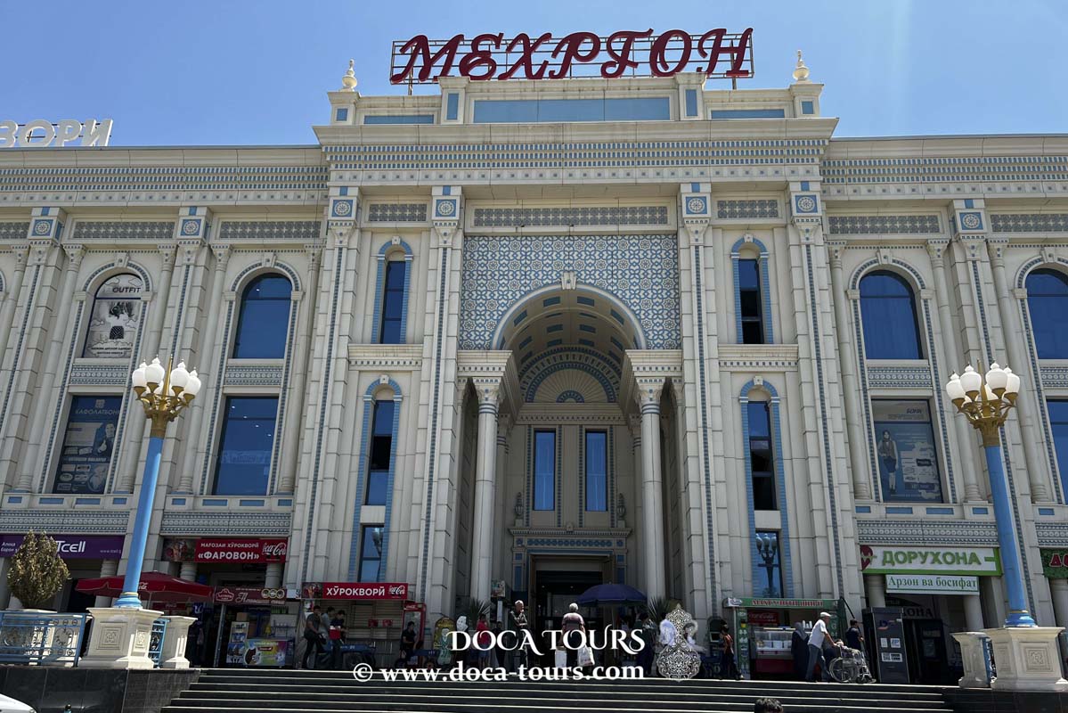 Marché Mehrgon : bazar couvert et coloré, alliant modernité et tradition commerciale tadjike.
