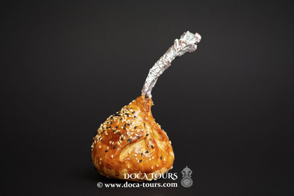 Distribuite circa un cucchiaino di ripieno sull’impasto. Formate una focaccina triangolare e posizionatela su una teglia rivestita di carta da forno, con il lato della chiusura rivolto verso il basso. Spennellate con il tuorlo sbattuto con latte e cospargete di semi di sesamo. Cuocete in forno per 30 minuti a 200°C.