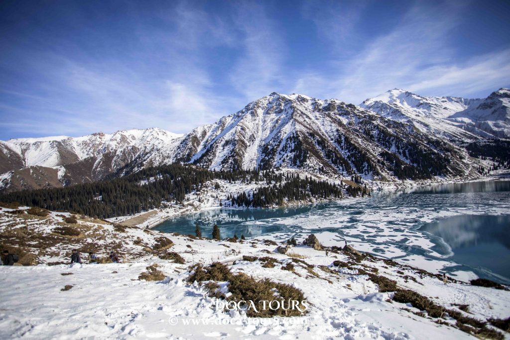 È circondato da cime montuose su tutti i lati e sorge in una depressione che ricorda uno specchio scintillante. Il Picco Sovetov (4317 m), il Picco Ozerny (4110 m) e il Picco Turist (3954 m) sono le tre principali vette che svettano sopra il lago; dall’estremità nord della diga sono ben visibili. La piramide alta 3681 metri, nota come Big Almaty Peak, si intravede dal centro della città ed è situata sulla cresta a ovest del Picco Turist.