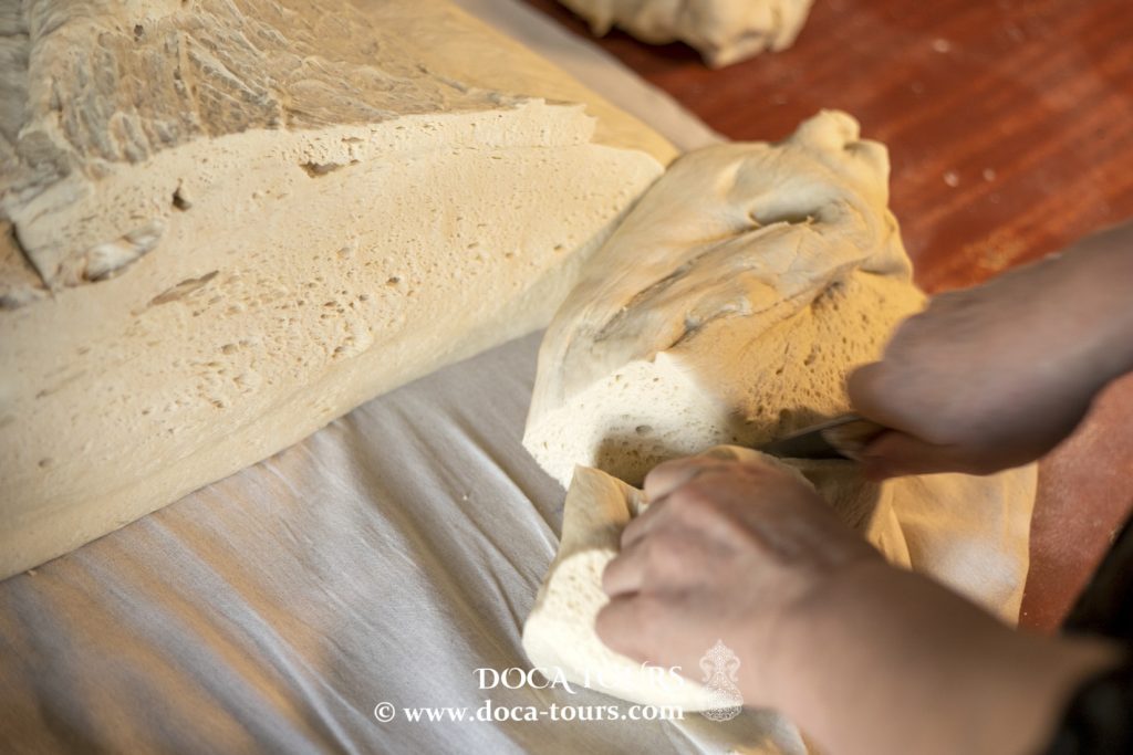 - Mettere l’impasto sul tavolo e, con l’aiuto delle mani, iniziare a premere sull’impasto per renderlo più facile da stendere.