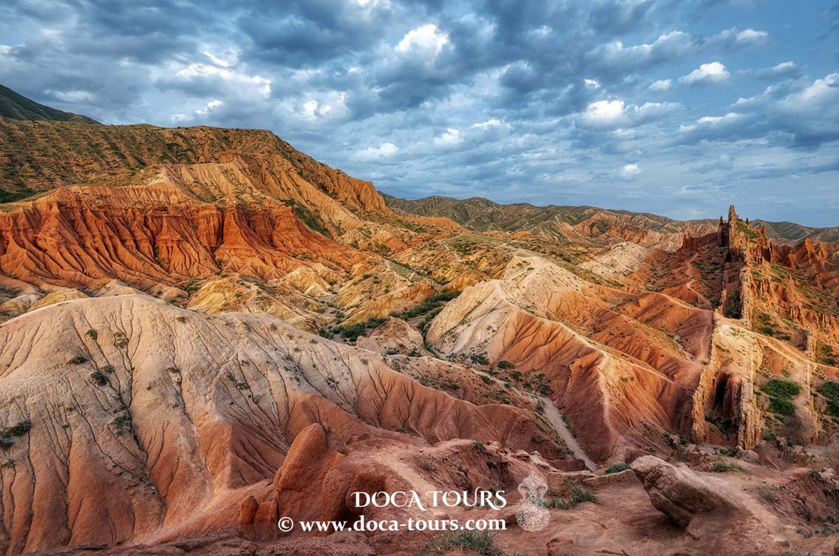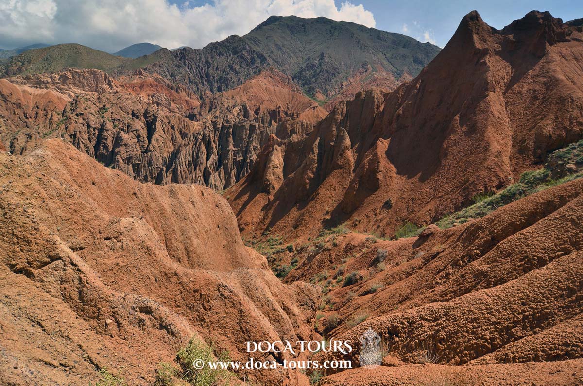 Il Canyon Konorchek, spesso definito il “Grand Canyon del Kirghizistan”, è una meraviglia naturale mozzafiato situata nel cuore dei Monti Tian Shan. Questa incredibile gola non è famosa solo per le sue vaste e impressionanti formazioni rocciose rosse, ma anche per il ricco significato storico e culturale che la circonda. Il soprannome del canyon riflette la sua grandiosità, richiamando paragoni con altri paesaggi di fama mondiale, come il Fairytale Canyon sul Lago Issyk-Kul. Il viaggio attraverso il Canyon Konorchek è un’esperienza ipnotica, che offre un perfetto connubio di bellezza naturale e misticismo, con luoghi come la Gola Boom (nota anche come Gola degli Spiriti Malvagi), un tempo considerata un luogo di pericolo e mistero. I Castelli Eolici, massicce scogliere modellate da secoli di vento ed erosione del suolo, si ergono come sentinelle nel canyon, assomigliando a antiche fortezze scolpite dalla terra stessa.