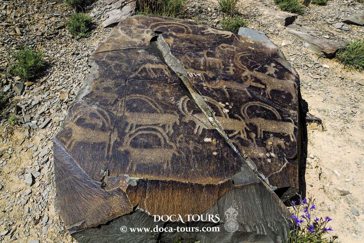 Nelle serene e tranquille valli della regione si trovano antichi petroglifi incisi dagli antenati nomadi del Kazakistan, sparsi sul terreno roccioso. Questi petroglifi offrono uno sguardo artistico sulla vita delle persone che un tempo percorrevano queste terre, lasciando un’eredità che collega il presente a un passato a lungo dimenticato.