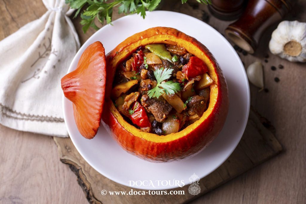 Chiamata “Gushtli Kovok” o “dimlama di Oshkovok (zucca)”. In uzbeko, “Shoh Kovuk” significa “zucca reale”. Un piatto straordinario della cucina tradizionale uzbeka, ideale per chi ama la zucca o, almeno, è neutrale verso di essa. La zucca viene usata come una pentola naturale in cui carne, grasso e cipolle vengono cotti al forno.