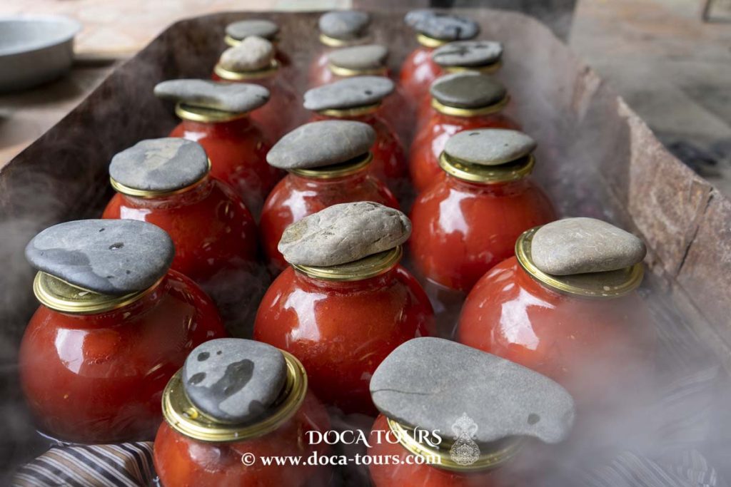 After all the necessary ingredients have been placed in the jar, it’s time to pour in the tomato juice. Carefully and gently, we pour the tomato juice into the jars to completely cover the vegetables and spices. It’s important to make sure that the juice sufficiently fills the jar, leaving a small amount of free space at the top for expansion and the fermentation process. Then the jars are tightly sealed with lids to prevent air from entering and to preserve the freshness and flavor of the marinade. We placed stones on top of the lids to provide additional pressure, which helps to keep the vegetables and spices fully submerged in the liquid.