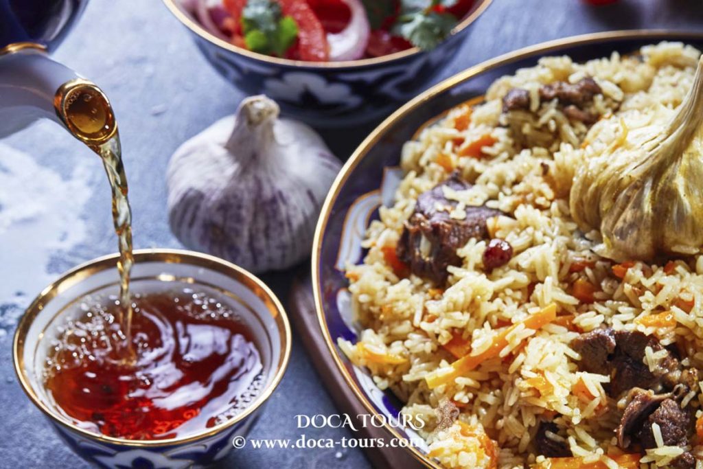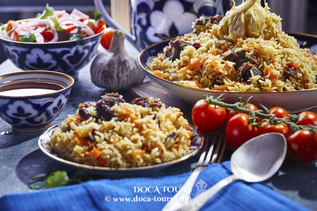 This recipe uses a special variety of rice, devzira, which grows in the Fergana Valley. It is not sanded and has a reddish color. It is this rice that gives the pilaf a unique taste and aroma; it does not stick together and remains crumbly.