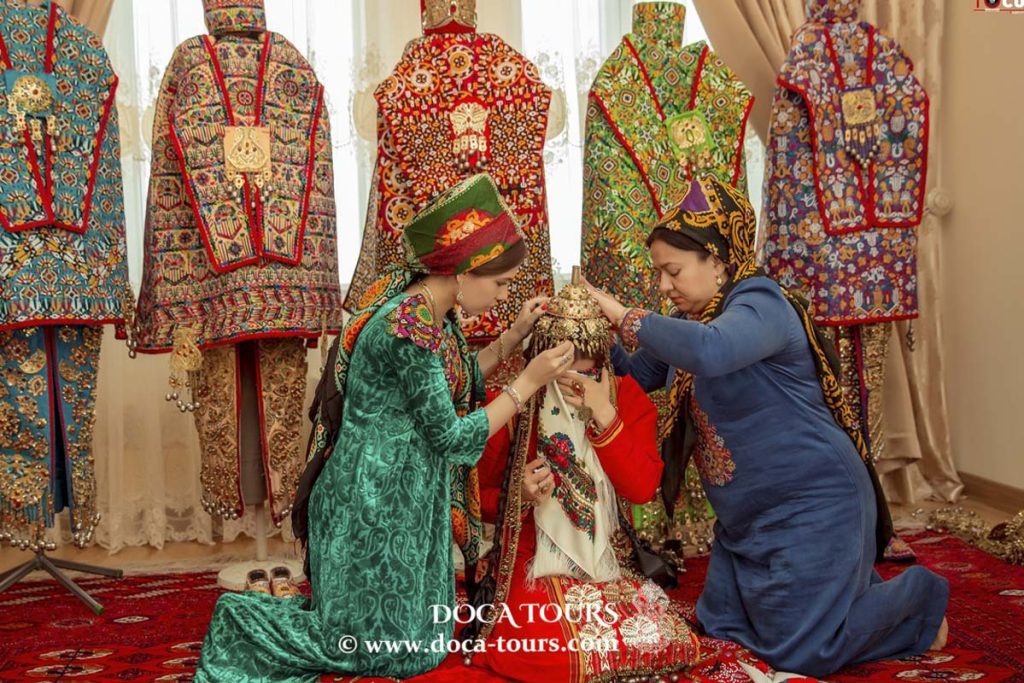 The day before the wedding, a ceremony called atgulak takes place in the groom’s house. The literal translation of the word Atgulak from Turkmen language means “horse ear”. Previously, these were scarves, now the gifts of the groom’s mother to her new relatives (the bride’s family), which are collected by the females of the family. In the courtyard, in big cauldrons, they cook traditional Turkmen dishes – pilaf, dograma, yarma, bake katlama, chelpek, and pisme.
